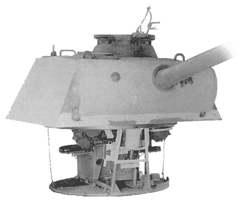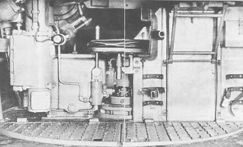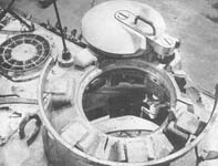 Le chargeur quant à lui était installé à la droite du canon dans la tourelle. Les parois de la tourelle étaient inclinées. Le puits de tourelle disposait d'un plancher circulaire rattaché à la tourelle via des tubes en acier et pivotait donc avec elle. L'energie pour la rotation de la tourelle était prise sur une boîte de transmission à travers le centre du plancher. Cette boîte était elle même reliée à un moteur à pétrole. Le compartiment de combat comportait très peu d'ouvertures: il y avait une grande trappe montée sur charnière sur la parois arrière de la tourelle, qui servait d'accès à l'équipage et au chargement des munitions ou à l'évacuation des douilles - une petite trappe sur la parois gauche de la tourelle en dessous de la coupole servait également à l'évacuation des douilles, cette trappe fut cependant supprimée à partir de l'Ausf.A - trois petites tapes de tir au pistolet qui furent également supprimées à partir de l'ausf.A. The loader sat to the right of the gun, in the turret. The walls of the turret were sloped. In the turret well was a circular floor attached to the turret via steel tubes, which swivelled along with the turret. Power for the turret traverse was taken off a gearbox, through the center of the floor. This box was connected to an oil-engine. As might be expected, the fighting compartment had relatively few openings: there was a large hatch, on hinges, mounted on the back wall of the turret. This was used as access for the crew, for loading ammunition or removing empty shell casings. There was another aperture for the removal of shell casings, a small hatch on the left wall of the turret, below the cupola. However, this hatch was eliminated on the Ausf.A model, as were three small pistol firing ports.