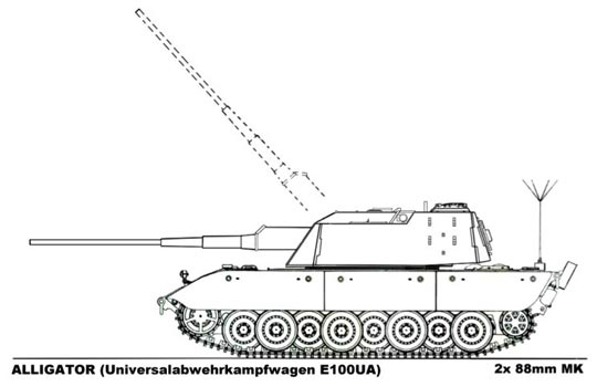 Flakpanzer E-100 Alligator (Fantasy/Fake ?) Dans les derniers mois de la guerre, les designers allemands envisagèrent de modifier la tourelle du Maus en tourelle anti-aérienne dans le but de fournir une super Flakpanzer en utilisant les caisses du Maus ou de l'E-100. Cette tourelle devait être armée de double canon de 88mm Flak 43 L/71. Si le projet n'arriva pas à terme, une tourelle en acier doux sera retrouvée en 1945 confirmant l'existence du projet. Selon les décideurs allemands, chaque bataillons de Maus ou de E-100 devait comporter 3 engins de ce type pour assurer la défense anti-aérienne. Ce super Flakpanzer qui devait peser entre 150 et 170 tonnes devait être dirigé par un équipage de 8 hommes comportant un pilote, un commandant, un tireur, un mécanicien et quatre chargeurs. Pour diriger ces 3 véhicules un véhicule de commandement doté d'équipements de télémétrie et d'obtention de cible devait être mis au point. Aucune de ces versions pas plus que l'E-100 ne vit jamais le jour. In the last months of the war, the German designers considered to modify turret of Maus in anti-aircraft turret to provide super Flakpanzer by using the hulls of Maus or E-100. This turret was to be armed with double gun of 88mm Flak 43 L/71. If the project did not arrive in the long term, a mild steel turret will be found in 1945 confirming the existence of the project. According to German decision makers', each battalions of Maus or E-100 was to comprise 3 machines of this type to ensure the anti-aircraft defence. This super Flakpanzer which was to weigh between 150 and 170 tons was to be directed by a crew of 8 men comprising a pilot, a commander, a gunner, a mechanic and four loaders. To direct these 3 vehicles a command vehicle equipped with target obtaining and distance measuring equipment was to be developed. None of these versions not more than E-100 was born never.