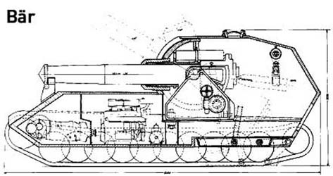 Sturmpanzer Bär En début mai de 1942, les décideurs allemands envisagèrent la conception d'un nouveau Sturmpanzer lourd, le Bär (ours). Début 1943, Krupp proposa donc un nouveau Sturmgeschütz armé du mortier lourd de 305 mm L/16. Les premiers schémas furent prêts mai de la même année. Le mortier de 305 mm sur ces dessins était monté dans une superstructure arrière sur châssis modifié de Panzerkampfwagen VI Ausf.E Tiger II comprenant également quelques composants de Panther et une nouvelle suspension développée par Krupp. Le poids estimé d'un tel engin environnait les 120 tonnes. Le mortier de 305 mm KwK L/16 possédait une portée maximale de 10.500 m et une élévation variant entre 0 et 70°. Il ne possédait pas à ma connaissance de champ de tir horizontal. Le mortier qui mettait à feu des projectiles de 50 kg, n'avait une provision que de 10 projectiles de 305 mm. At the beginning of May of 1942, the German decision makers considered the design of new heavy Sturmpanzer, Bär (bear). At the beginning of 1943, Krupp thus proposed new Sturmgeschütz armed with the heavy mortar of 305 mm L/16. The first diagrams were ready May of the same year. The mortar of 305 mm on these drawings was assembled in a back superstructure on modified chassis of Panzerkampfwagen VI Ausf.E Tiger II also including some components of Panther and a new suspension developed by Krupp. The weight of such a machine estimated surrounded the 120 tons. The mortar of 305 mm KwK L/16 had a maximum range of 10.500 m and an elevation varying between 0 and 70°. It did not have to my knowledge of horizontal field of fire. The mortar which fired projectiles of 50 kg, had a provision only of 10 projectiles of 305 mm.