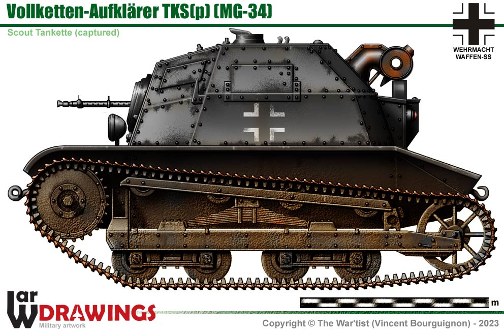 After the conquest of Poland, captured tankettes were used by the German army in various support roles, mostly for training, security duties or as artillery tractors. Many captured tankettes were also used by the Luftwaffe for airfield security and snowplowing. Here, the original 7.92 mm machine gun CKM WZ.25 (Hotchkiss) is replaced by a German MG-34 of the same caliber. |