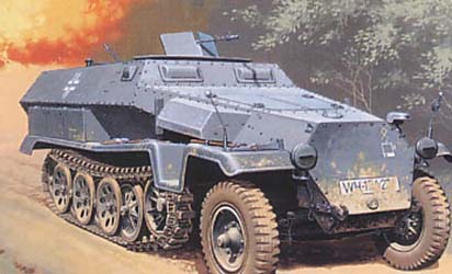 Mittlerer Schützenpanzerwagen Sd.Kfz.251 (Armored Personnel Carrier) Genesis Au contraire des véhicules blindés à roues, les véhicules semi-chenillés jouèrent un rôle majeur dans les activités militaires de l'armée allemande durant le deuxième conflit mondial. Dans la deuxième partie de la guerre ces véhicules rempliront la quasi totalité des missions remplies d'habitude par les automitrailleuses. L'idée originale de ce type de véhicule blindé de transport de personnel, revient à un Français, Adolphe Kégresse directeur du parc automobile du tsar de Russie. Au début du 20e siècle remplaça par un boggie avec chenilles de caoutchouc, le train arrière d'un véhicule du tsar. L'idée était d'obtenir une bien meilleure adhérence sur la neige et le verglas en hiver. Kégresse revient en France en 1917 chez Citroën et y impose son idée avec quelques succès commerciaux à la clé. Au cours des années 20-30, les armées françaises, britanniques et américaines disposeront toutes des autochenilles Citroën-Kégresse sans toutefois exploiter à fond leurs possibilités militaires. D'ailleurs les Britanniques vers la fin de 1930, abandonneront les half-tracks. Les Américains par contre continueront dans cette voie en développant la gamme de véhicules semi-chenillés M3 directement dérivée de l'idée originale de Kégresse et particulièrement robuste. Les Allemands quant à eux avaient mis au point leur premier half-tracks vers la fin de la première guerre mondiale chez Daimler-Benz. Le Marienwagen Bremer était un camion Daimler recouvert de la caisse d'une auto-blindée Erhardt. Les roues arrière sont remplacées par de simple chenilles à bande de caoutchouc. Quatre exemplaires seulement seront produits. Jusqu'à la fin de la guerre d'autres essais mineurs seront mis au point sans grand succès. On the contrary armoured vehicles with wheels, the half-tracked vehicles played a major role in the military activities of the German army during the second world war. In the second part of the war these vehicles will fill to it quasi totality of the missions fulfilled usually by the armoured cars. The original idea of this type of armoured transport of personnel, returns to a French, Adolphe Kégresse director of the automobile park of the tsar of Russia. At the beginning of the 20th century he replaced by a bogie truck with rubber tracks, the rear wheel-axle unit of a vehicle of the tsar. The idea was to obtain a much better adherence on snow and the glaze in winter. Kégresse returns in France in 1917 at Citroen and imposes its idea on it with some commercial successes on the key. During years 20-30, the French, British and American Armies had all the Citroen-Kégresse half-tracked tractors without however exploiting in totality their military possibilities. Moreover the British towards the end of 1930, will reject the half-track vehicles. The Americans on the other hand will continue in this way by developing the series of half-tracked vehicles M3 directly derived from the original Kégresse's design and particularly robust. The Germans as for them had developed their first half-tracked vehicles towards the end of the First World War at Daimler-Benz. Marienwagen Bremer was a Daimler truck covered with the superstructure of one armoured-car Erhardt. The aft wheels are replaced by simple tracks with rubber belting. Four specimens only will be produced. Until the end of the war of other minor tests will be developed without much success.