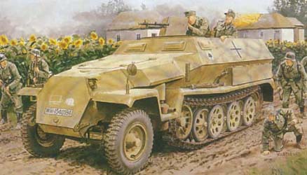 Le châssis produit par Hanomag était surmonté par une caisse provenant de chez Büssing-NAG dotée d'un blindage frontal de 14.5 mm et de 8 mm sur les côtés. Ce véhicule est officiellement dénommé Sd.Kfz.251 et baptisé Mittlerer Schützenpanzerwagen (véhicule blindé moyen d'infanterie). Les premiers engins sortirons des chaînes d'assemblage en 1939 et iront directement équiper une compagnie d'infanterie de la 1re Panzerdivision. L'Inspecteur général des troupes blindés, le Général Guderian est très impressionné par ce nouveau véhicule et en exige l'emploi général pour toute la Panzertruppe. En septembre 1939, lors du début de l'invasion de la Pologne, les Sd.Kfz.251 équipent deux Panzerdivisions (1 et 2) et forment avec les chars le fer de lance de l'offensive et une partie intégrante du concept du Blitzkrieg (la guerre éclaire). The chassis produced by Hanomag was surmounted by a superstructure coming from Büssing-NAG equipped with a frontal shielding of 14.5 mm and 8 mm on the sides. This vehicle is officially called Sd.Kfz.251 and baptized Mittlerer Schützenpanzerwagen (medium armoured vehicle of infantry). The first machines will leave the assembly lines in 1939 and directly will equip an infantry company of 1st Panzerdivision. The general Inspector of the armoured troops, the General Guderian is very impressed by this new vehicle and requires of it general employment for all Panzertruppe. In September 1939, at the time of the beginning of the invasion of Poland, Sd.Kfz.251 equip two Panzerdivisions (1 and 2) and form with the tanks the spearhead of the offensive and an integral part of the concept of Blitzkrieg (the lightning war).