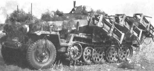 Le Sd.Kfz.251/1 fut également utilisé pour le lancement de fusées Wurfkörper de 280mm (ogives en pétrole gélifié) transportées sur six bâtis (inclinés à 45°) montés sur les côtés de la superstructure. Ces véhicules permettait à moindre coût de fournir un appui feu lourd. Un viseur était monté sur le capot à l'intention du pilote qui fournissait le pointage horizontale des lanceurs en positionnant son véhicule. Les fusées (wurfrahmen) étaient tirées l'une à la suite de l'autre. Bien que rudimentaire, ce montage se révélaêtre très efficace notamment lors des combats urbains. Ces armes seront très utilisés à Stalingrad et Varsovie avec des résultats souvent très effrayants. Sd.Kfz.251/1 was also used for the launching of Wurfkörper rockets of 280mm (gelled oil warheads) carried onto six frames (tilted with 45°) assembled on the sides of the superstructure. These vehicles made it possible with lower cost to provide a heavy support of fire. A sight was assembled on the cap for the pilot who provided the horizontal pointing of the launchers by positioning his vehicle. The rockets (wurfrahmen) were drawn one following the other. Although rudimentary, this very effective assembly proved to be very effective in particular at the time of the urban combat. These weapons will be very much used in Stalingrad and Warsaw with very spectacular results often.