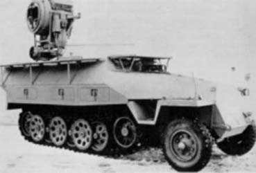 Sd.Kfz.251/20 mittlere Schützenpanzerwagen (Infrarotscheinwerfer)Le Sd.Kfz.251/20 (Uhu ou Hiboux) était un véhicule spécialisé pour le combat de nuit. Mis au point en 1944, au moment où furent mises au point des unités spéciales pour combat de nuit équipées de Panther. Il était équipé d'un projecteur infrarouge (Beobachtungsgerät 251) sur affût tournant installé dans le compartiment arrière. Il était également équipé d'une lunette de visée. En opération, l'opérateur du projecteur capturait des cibles intéressantes invisibles à l'oeil nu et contactait le char Panther qui s'occupait de traiter l'objectif. Notons que le Panther était également équipé de ses propres viseurs de nuit mais moins puissants (max. 500 m). Sd.Kfz.251/20 (Uhu or Owls) was a vehicle specialized for the combat of night. Developed in 1944, at the moment when were developed of the special units for combat of night equipped with Panthers. It was equipped with an infra-red projector (Beobachtungsgerät 251) on turning mounting installed in the back compartment. It was also equipped with a sight tube. In operation, the operator of the projector captured interesting targets, invisible for the naked eye and contacted the Panther tank which dealt with treating the objective. Let us note that the Panther was also equipped with its own sights of night but less powerful (max. 500 m).