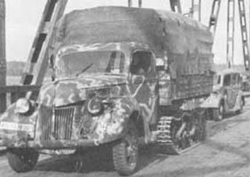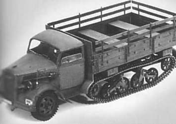Zugkraftwagen (Prime Movers) Sd.Kfz.3a/b/c Gleiskettenlastkraftwagen 2t offen "Maultier"Pour approvisionner en munitions, en carburant et autres fournitures, les troupes engagées sur les terrains en mauvais état du front oriental, des camions 4x2 standards de 3 tonnes (Opel (3a)/Ford (3b)/Klockner-Humbolt-Deuts (3c) et Mercedes) furent transformés en véhicules semi-chenillés tout terrain. Ce modèle d'intérim , fut réalisé pour pallier le retard du Schwerer Wehrmachtschlepper. Pour ce faire, le train arrière fut enlevé et remplacé par un train chenillé (type Cardan Lloyd) avec des chenilles de Pz.Kpfw I ou II (Mercedes). To supply in ammunition, fuel and other supplies, the troops engaged on the grounds in bad condition of the Eastern front, standard 4x2 trucks of 3 tons (Opel (3a)/Ford (3b)/Klockner-Humbolt-Deuts (3c) and Mercedes) was transformed into cross country half-tracked vehicle. This model of interim, was realized to palliate the delay of Schwerer Wehrmachtschlepper. With this intention, the rear wheel-axle unit was removed and replaced by a tracked train (Cardan Lloyd type) with tracks of Pz.Kpfw I or II (Mercedes).
