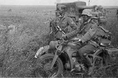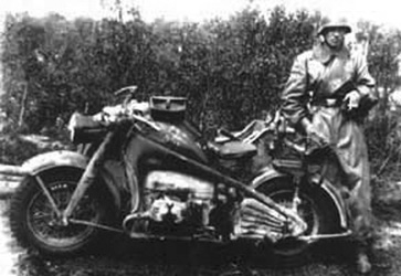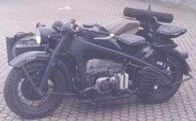 Zündapp Motorcycles Zündapp KS-750La Zündapp KS-750 fait partie de la catégorie des motos lourdes (supérieures à 500 cc). Elle fut conçue pour recevoir un side-car mais fut également largement utilisée sans. Cette moto fut l'une des "deux roues" de base des bataillons motocyclistes des divisions blindées et motorisées de la Wehrmacht et des Waffen-SS. Toutefois, toutes les unités des divisions en étaient généralement pourvues. Une division blindée comprenait en général (1943) 480 de ces véhicules. Dans les divisions d'infanterie le nombre était supérieur à 400 jusqu'en 1943 et par après réduit à 170, les motos y étant supplantées par les "quatre roues". La BMW R-75 fut fabriquée à 18695 exemplaires entre 1940 et 1948. Zündapp KS-750 belongs to the category of the heavy motor bikes (more than 500 cc). It was conceived to receive a side-car but was also largely used without. This motor bike was one of the basic "two-wheels" of the motorcylcists battalions of armoured and motorized divisions of Wehrmacht and Waffen-SS. However, all the units of divisions were generally equipped with it. An armoured division in general included (1943) 480 of these vehicles. In divisions of infantry the number was higher than 400 until 1943 and by after reducted to 170, the motor bikes y being supplanted by the "four-wheels". The BMW R-75 was manufactured with 18695 specimens between 1940 and 1948.