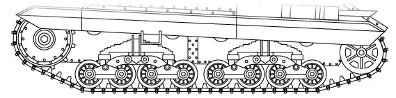 La suspension identique à celle des chars moyens était composée sur chaque côté par un barbotin (double) à l'avant, une poulie de tension de chenilles (double) réglable à l'arrière, trois rouleaux porteurs et deux groupes (avec ressorts à lames) de double bogies oscillants. Chaque bogies accueillait deux double-gallets de route avec bandes de caoutchouc. The suspension (identical to that of the medium tanks) was made up on each side by a sprocket-wheel (double) in front, an idler (double) adjustable to the back, three return rollers and two groups (with leaf springs) of double oscillating bogies. Each bogies accomodated two double road-wheels with rubber belting.