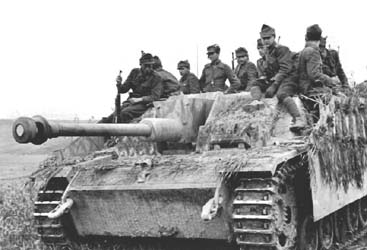 Le Sturmgeschütz III ou StuG III, fut à l'origine conçu comme un canon d'assaut à partir du Panzerkampfwagen III. Il était armé d'un canon court de 75 mm StuK L/24 similaire à celui des premiers Panzers IV dans une casemate anguleuse entièrement fermée. Cependant au cours de Barbarossa il fut décidé de faire de ce canon d'assaut un chasseur de char pour contrer la menace des chars russes T-34/76 et KV-I. Comme pour le Panzer IV on y installa un canon long de 75 mm StuK L/43 (Ausf.F) puis un L/48 (Ausf.G). Le StuG III était devenu dès lors un blindé multi-taches capable d'assurer en plus de son rôle initial de canon d'assaut, un rôle de chasseur de char efficace voir plus tard de char de combat de substitution (pour combler les pertes de plus en plus importantes). Avec sa silhouette fort basse il était de plus une cible difficile à atteindre. Le StuG III Ausf.G fut le modèle le plus produit de la série, avec plus de 7800 exemplaires produits. La série des StuG III culmine à 10500 exemplaires environ de tout type. Le StuG III pouvait être équipé de Schürzen sur les flancs. Le StuG III Ausf.G utilisait le châssis du Panzer III Ausf.M. Cinquante exemplaires du StuG III Ausf.G furent livrés à l'armée hongroise. Ils iront équiper le 7e bataillon de canon d'assaut de la 1re division blindée hongroise (40) et la 2e division blindée hongroise (10) en 1944. Très bien utilisés par leurs équipages hongroises ils revendiquèrent 67 blindés adverses détruits en date du 9 octobre 1944 pour seulement 10 StuG III perdus. Il se firent encore remarquer positivement à la bataille de Szentes de concert avec des Zrinyi II. Sturmgeschütz III or StuG III, was at the origin conceived like an assault gun based on the Panzerkampfwagen III. It was armed with a gun court of 75 mm StuK L/24 similar to that of first Panzers IV in an entirely closed angular casemate. However during Barbarossa it was decided to make of this assault gun, a tank destroyer to counter the threat of the Russian tanks T-34/76 and KV-I. As for Panzer IV one installed there a 75 mm long gun StuK L/43 (Ausf.F) then L/48 (Ausf.G). StuG III had consequently become an armored vehicle multitasks able to ensure in addition to its initial role of assault gun, a role of effective tank destroyer to see later battle tank of substitution (to fill the increasingly important losses). With its extremely low silhouette it was moreover one target difficult to reach. StuG III Ausf.G was the model more produced of the series, with more than 7800 produced specimens. The series of StuG III culminates to 10500 specimens approximately of any type. StuG III could be equipped with Schürzen on the sides. StuG III Ausf.G used the chassis of Panzer III Ausf.M. Fifty specimens of StuG III Ausf.G were delivered to Hungarian army. They will equip the 7th battalion with of assault gun of the 1st Hungarian armord division (40) and the 2nd Hungarian armored division (10) in 1944. Used very well by their Hungarian crews they asserted 67 Russian tanks destroyed dated October 9, 1944 for only 10 StuG III lost. It were still pointed out positively during the battle of Szentes in liaison with Zrinyi II.