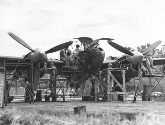Sur le théâtre du Pacifique, les pilotes de Lightning détruisirent 1800 avions japonais (plus que tout autre chasseur sur ce secteur d'opération), et plus de cent d'entre-eux devinrent des as (plus de 5 avions abattus). Si le Lightning ne pouvait rivaliser en combat tournoyant avec le Zero et les autres chasseurs japonais, se grande vitesse et son bon taux de montée, lui permettait d'effectuer de nombreux passages rapides sur sa cible pour la mitrailler. La puissance de feu et la grande portée de tir de son armement firent des ravages sur la faible protection chronique des chasseurs japonais (les chasseurs allemands étant bien plus solides et coriaces à ce point de vue). La grande autonomie du Lightning (améliorée par un mélange allégé) couplé aux capacités élevées de ravitaillement et de maintenance de l'US Navy, firent merveille sur ce théâtre aux distances gigantesques au dessus de l'océan. A la fin 1944, il n'était pas rare que les P-38L en Nouvelle Guinée néerlandaise effectuent des déplacements de 1530 km, combattent durant 15 minutes et retournent à leur base. Cependant, le théâtre du Pacifique resta relativement peu fourni en comparaison du théâtre européen, mais les Lightning y firent cependant du très bon boulot. Ce fut un Lightning qui abattit l'avion de l’amiral Yamamoto en 1943. Notons qu'en raison de la chaleur sous ces latitudes, les pilotes volaient souvent verrière ouvertes, ce qui pouvaient créer de fortes turbulences sur le stabilisateur arrière. On the Pacific Theater, Lightning pilots destroyed 1800 Japanese aircraft (more than other fighter in this operation sector)and more one hundred of between them became Aces (more than 5 aircraft destroyed). If the Lightning could not compete in dogfight with Zero and other Japanese fighters, is high speed and its good rate of climb, allowed it to strafe many fast passages on its target. The firepower and the long fire range of its guns made havoc on the low chronic protection of Japanese fighters (the German fighters being far more solid and tough to this point of view). The autonomy of the Lightning (enhanced by a Lite mix) coupled with high supply and maintenance capacity of the U.S. Navy, made wonder in the theatre at huge distances across the ocean. At the end of 1944, it was not uncommon that the P-38 L in Dutch New Guinea perform raids of 1530 km, fight during 15 minutes, and return to their base. The Pacific Theater remained relatively providedin P-38 compared to the European Theater, the Lightning made however, very good job. This was a Lightning which destroyed the plane Admiral Yamamoto in 1943. Note that due to the heat in these latitudes, pilots flew often canopy open, which could create severe turbulence on the rear stabilizer.