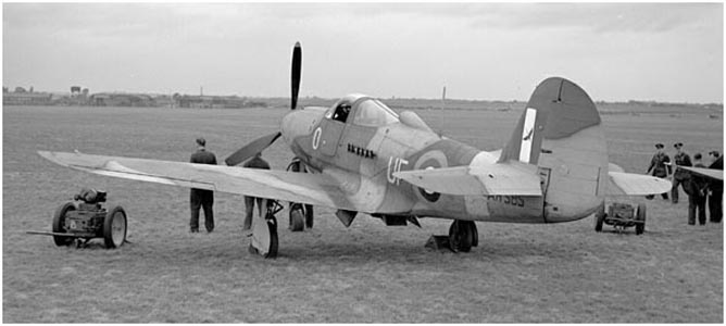 Les Britanniques cédèrent la totalité des avions déjà livrés et devant encore l'être, à la force aérienne russe. Seul un exemplaire fut conservé et utilisé par la Royal Navy comme avion expérimental . Il fut modifié en chasseur embarqué (une première pour un train d'aterrisage tricycle) et effectua son premier apontage le 4 avril 1945 sur le HMS Pretoria Castle. Les essais seront abandonnés en mars 1946. The British ceded the entire aircraft already delivered and yet to be send, to the Russian Air Force. Only one plane was retained and used by the Royal Navy as an experimental aircraft. It was modified in carrier fighter (a first for a tricycle undercarriage aircraft) and made its first deck landing on 4 April 1945 on HMS Pretoria Castle. The tests will be discontinued in March 1946.