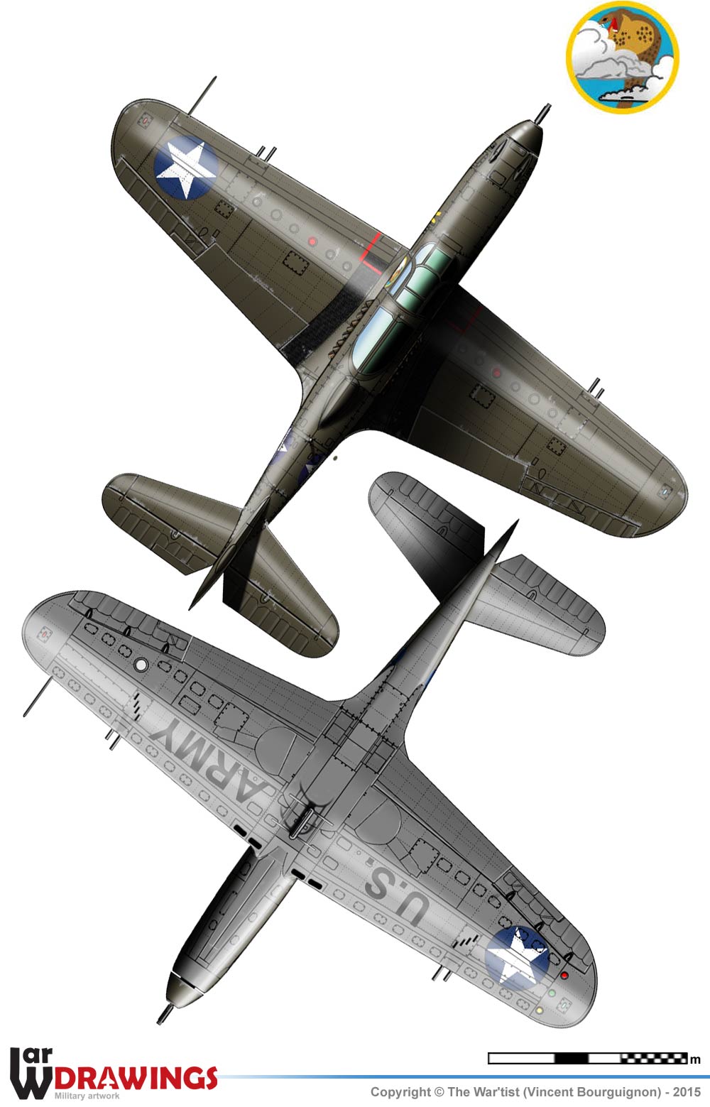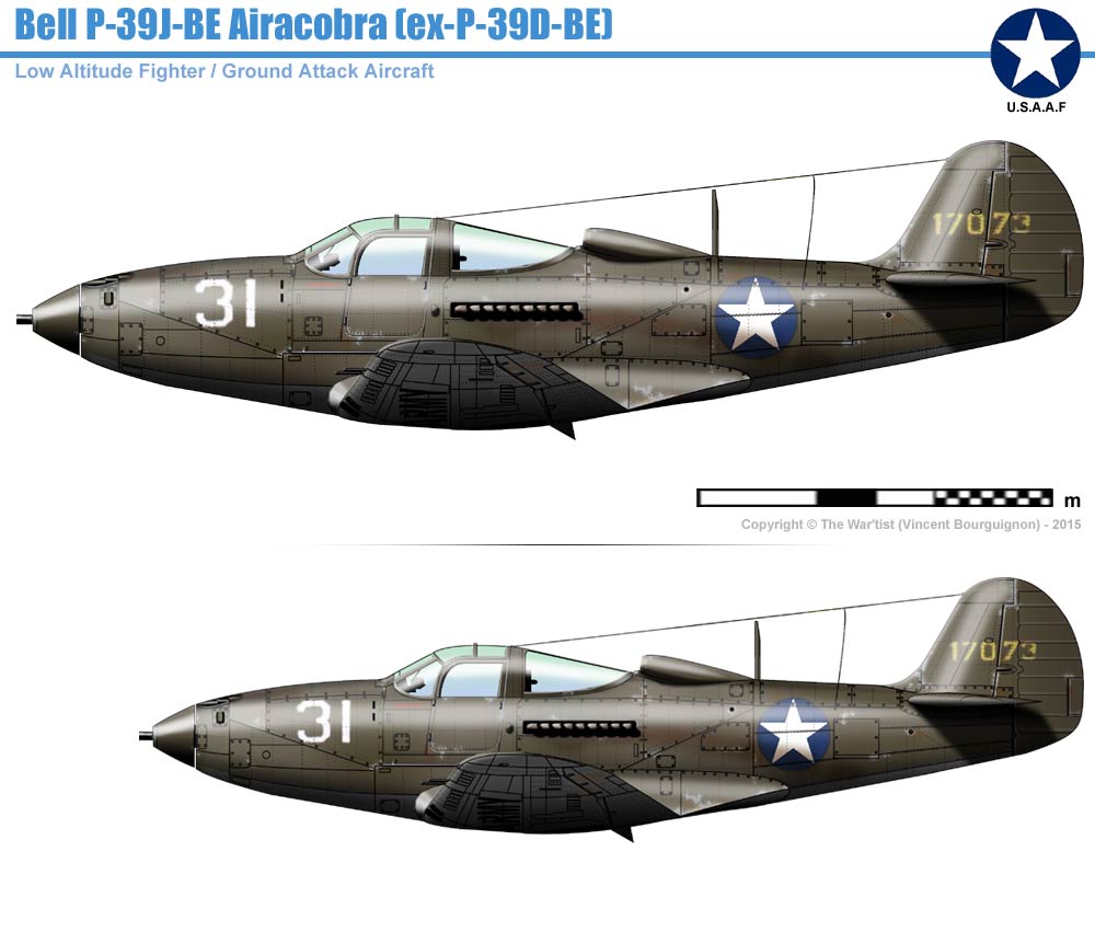 P-39J (Bell Model 15B) Variante du P-39F équipée d'un moteur V-1710-59 de 1100 cv avec commandes automatiques de suralimentation. 25 avions construits. Ce sont en fait les 25 derniers P-39F fabriqués et livrés sous la désignation de P-39J. Variant of P-39F equiped with a V-1710-59 of 1100 hp engine with automatic boost commands. 25 aircraft built. These are actually the last 25 P-39F manufactured and delivered under the designation P-39J.