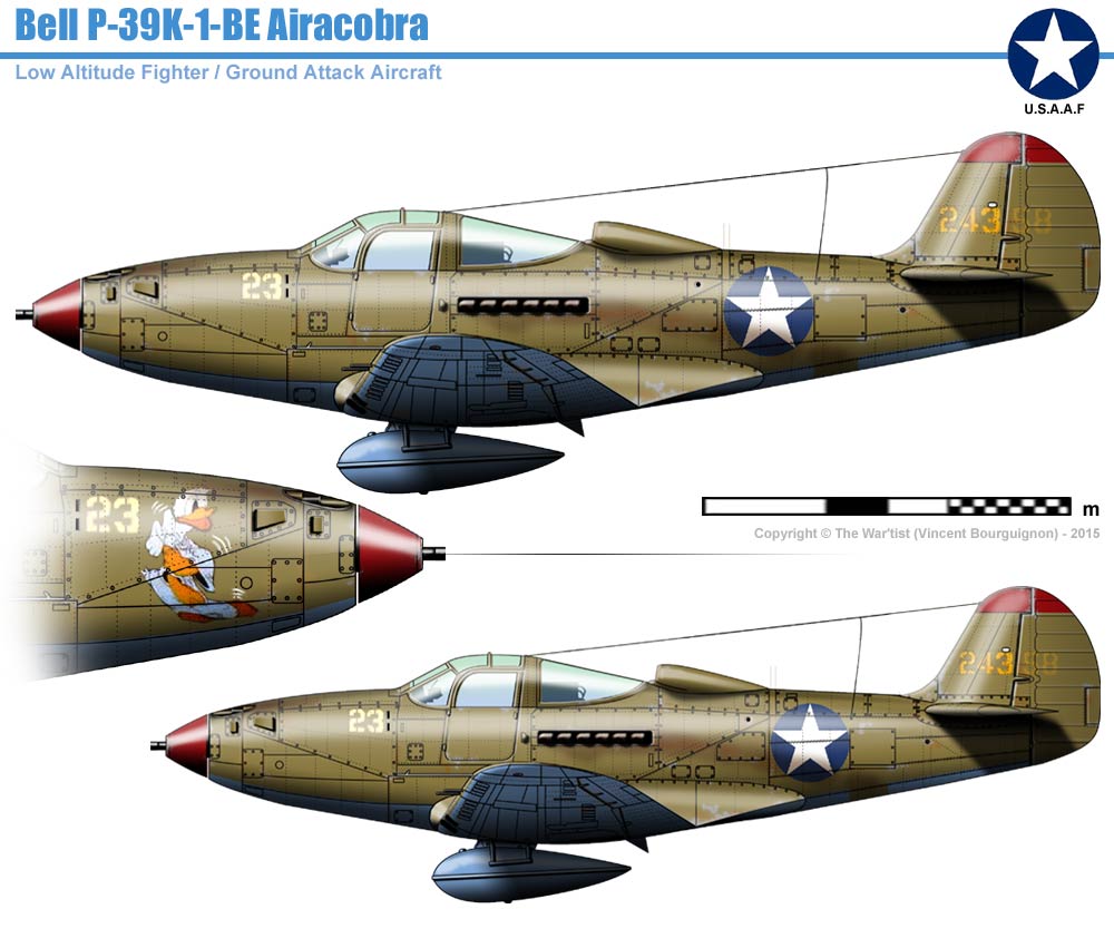 Les P-39K font partie de la commande initiale de P-39G et censés être similaire au P-39D-2 à l'exception de l'hélice (Aeroproducts au lieu de Curtiss-Electrics), ils furent produits avec un moteur diffèrent et un poids supérieur et utilisés en Nouvelle Guinée par les Américains. P-39K are part of the initial P-39G order and supposed to be similar to the P-39D-2 except for the propeller (Aeroproducts instead of Curtiss-Electrics), they were produced with a different engine and a higher weight and used in New Guinea by the Americans.