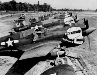 Cependant c'est sur un tout autre théâtre que le P-40 entrera dans la légende. En effet c'est au sein du 1st American Volunteer Group qui combattra en Chine et Birmanie, les fameux Tigres volants, que le P-40 se fit vraiment connaître. Ce groupe fut formé en 1941 par Claire Chennault avec des pilotes volontaires de l'armée américaine volant sur des P-40Bs. Ces avions avec leur puissant armement, leur blindage et leurs réservoirs auto-obturants connurent leur baptême du feu fin décembre 1941. Ils remportèrent de nombreux succès contre les chasseurs japonais de tout type (y compris le fameux A6M Zero). Les P-40Bs des Tigres volants (avec leur gueules de requin peinte sur le nez) grâce aux tactiques de combat intelligemment mises en place par Chennault purent tirer leur épingle du jeu face à des adversaires pourtant plus agiles. Le 1st American Volunteer Group, réorganisé ensuite en 23rd Fighter Group utilisera le P-40 jusqu'en Novembre 1943 quand il fut remplacé par le P-51 Mustang. Le P-40 fut aussi utilisé par d'autres unités sur le théâtre Sino-Indo-Birmain où ils participèrent au maintient de la supériorité aérienne alliée jusqu'à la fin de la guerre. However this is on a completely different theater that the P-40 will enter in the legend. Indeed it is in the 1st American Volunteer Group who will fight in China and Burma , the famous Flying Tigers , the P-40 really will be famous. This group was formed in 1941 by Claire Chennault with volunteers pilots from the U.S. military flying on P-40Bs. These aircraft with their powerful weapons, armor, and their self- sealing fuel tanks were their baptism of fire in late December 1941. They won many successes against the Japanese fighters of any type (including the famous A6M Zero). P-40Bs Flying Tigers (with their shark mouths painted on the nose) through combat tactics intelligently implemented by Chennault could take their pin of the game face yet more agile opponents. The 1st American Volunteer Group, and then reorganized 23rd Fighter Group will use the P-40 until November 1943 when it was replaced by the P-51 Mustang. The P-40 was also used by other units on the China-India-Burman theater where they participated in the maintenance of the Allied air superiority until the end of the war.
