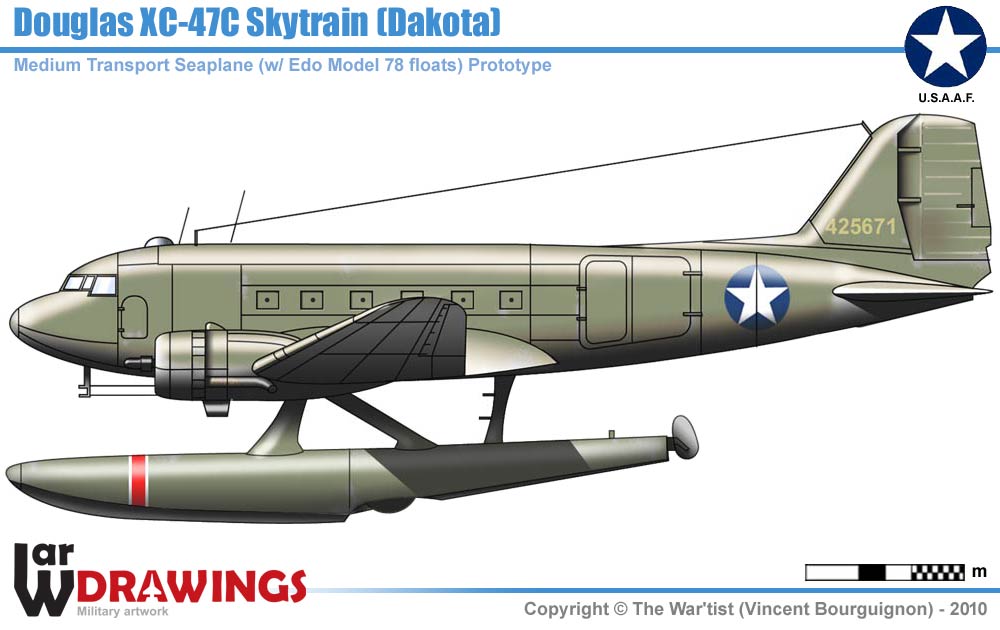 with amphibian float gear as prototype XC-47C. Crashed on 13th November 1943, Jamaica Bay, NY during overload tests. |