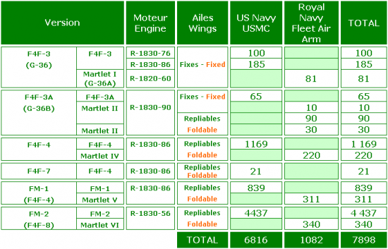 Cependant le nouveau chasseur livre des performances excellentes et et le contrat est augmenté à 78 exemplaires en août 1939. Le premier F4F-3 de série effectua son premier vol en février 1940, suivit de celui du second avion, cinq mois plus tard, et l'avion est définitivement accepté pour le service par la Navy en janvier 1941. Le F4F-3 était armé de deux mitrailleuses .50 (12.7 mm) Browning dans le capot et deux autres dans les ailes. Cependant par la suite le nouveau chasseur sera construit (avec les 4 mitrailleuses montées dans les ailes, avec un train d'atterrissage et un blindage renforcés. Le F4F-3 produit à 366 exemplaires, conçu comme chasseur embarqué avait cependant les ailes fixes. Les ailes repliables ne seront adoptés de façon définitive qu'en avril 1941 sur le F4F-4 (bien que les derniers F4F-3A en seront également dotés). Le moteur R-1830-76 connu de nombreux problèmes et sera remplacé dans un premier temps de manière expérimentale sur le XF4F-6 par un R-1830-30. Le prototype XF4F-6 s'écrasa cependant en mai 1942. Néanmoins le nouveau moteur sera adapté sur le F-4F-3 qui sera rebaptisé F4F-3A (195 exemplaires), 65 furent livrés au US Marine Corps). However the new fighter delivers excellent performance and and the contract is increased to 78 copies in August 1939. The first series F4F-3 first flew in February 1940, followed by that of the second aircraft, five months later, and the plane is definitely accepted for service by the Navy in January 1941. The F4F-3 was armed with two .50 machine guns (12.7 mm) Browning in the hood and two others in the wings. However subsequently the new fighter will be built (with 4 machine guns mounted in the wings, with reinforced landing gear and armor. The F4F-3 produced at 366 copies, designed as carrier-borne fighter however had fixed wings. The folding wings will be adopted permanently only in April 1941 on the F4F-4 (although as will be equipped with the latest F4F-3A). The R-1830-76 engine known problems and will be replaced by an R-1830-30 in first experimentally on the XF4F-6. The XF4F-6 prototype crashed however in May 1942. Nevertheless the new engine will be adapted on the F-4F-3, which will be renamed F4F-3A (195 copies), 65 were delivered to the US Marine Corps).