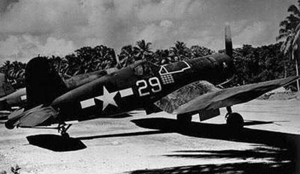 L'US Navy accepte finalement le Corsair comme avion embarqué en avril 1944, après qu'un amortisseur oléopneumatique plus long ait été installé, réduisant à néant sa proportion à rebondir. La première unité cependant à opérer vraiment à partir d'un porte-avion américain, fut la VMF-124 du Corps des Marines sur l'USS Essex. Le véritable déclencheur de la carrière du Corsair sur les porte-avions américains fut l'utilisation de plus en plus massive par les Japonais d'avions Kamikazes. Le Corsair était l'intercepteur le plus apte pour contrer cette menace. Pourtant le premier combat du Corsair ne fut guère impressionnant. En effet connus sous le nom de massacre de la Saint Valentin, une douzaine de Corsairs de la VMF-124 participèrent le 14 février 1943 à un raid avec des P-40 et des P-48 en soutient de B-24 Liberator contre l'aérodrome japonais de Kahili. Deux Corsairs, quatre P-38, deux P-40 et deux Liberators furent perdus pour seulement 4 Zero japonais ! Mais après coup, les Marines firent un bien meilleur usage de leur nouveau pur-sang et le Corsair démontra bien vite sa supériorité sur ses opposant nippons. Chez les Japonais, le Corsair deviendra légendaire sous le nom de « mort sifflante » en raison du bruit que faisait l'air sur les bords d'attaque des ailes. The Navy finally agreed to the Corsair as carrier-based aircraft in April 1944, after a longer oleo has been installed, reducing to nil its proportion to bounce. The first unit however to really operate from an American aircraft carrier, was on the USS Essex, Marine Corps VMF-124. The real trigger of the career of Corsair on the U.S. carriers was the more massive use by Japanese of kamikaze aircraft. The Corsair was the interceptor the fittest to counter this threat. Yet the first fight of the Corsair was hardly impressive. Indeed known as the Saint Valentine's massacre, a dozen Corsairs of VMF-124 participated on February 14, 1943 in a raid with P-40 and P-48 in support of B-24 Liberator against Japanese Kahili airfield. Two Corsairs, four P-38, two P-40 and two Liberators were lost for only 4 Japanese Zero! But afterward, the Marines made a much better use of their new Thoroughbred and the Corsair quickly demonstrated its superiority over its Japanese opponents. Among Japanese, the Corsair will become legendary as the 'wheezing death' because of the noise that did air on the leading edges of the wings.