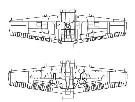 Le F6F était un monoplace à ailes basses contrairement au F4F qui était un monoplace à ailes médianes (implantées au centre du fuselage). L'implantation basse des ailes permet de dégager le champ de vision du pilote et d'implanter un train d'atterrissage plus court. Notons que sur le F4F ce dernier, très étroit, n'était pas monté sous les ailes mais sous le fuselage par action manuelle du pilote. Sur le Hellcat le large train d'atterissage hydraulique pivotait et venait se rétracter vers l'arrière, à plat dans ses logements parallèles au fuselage. Les ailes étaient en deux parties. La partie externe, la plus grande, pouvait pivoter pour venir se placer le long du fuselage, pour gagner de la place dans les hangars ou sur le pont d'envol d'un porte-avion. The F6F was a single-seater craft with low wings contrary to the F4F which was a single-seater craft with median wings (mounted on the center of the fuselage). Low establishment of the wings makes it possible to release the field of view of the pilot and to establish a shorter landing gear. Let us note that on the F4F this last, very narrow, was not assembled under the wings but under the fuselage by manual action of the pilot. On Hellcat the broad hydraulic landing gear swivelled and came to retract towards back, flat in its housings parallel with the fuselage. The wings were in two parts. The external part, largest, could swivel to come to be placed along the fuselage, to gain place in the hangars or on the take-off deck of a carrier.