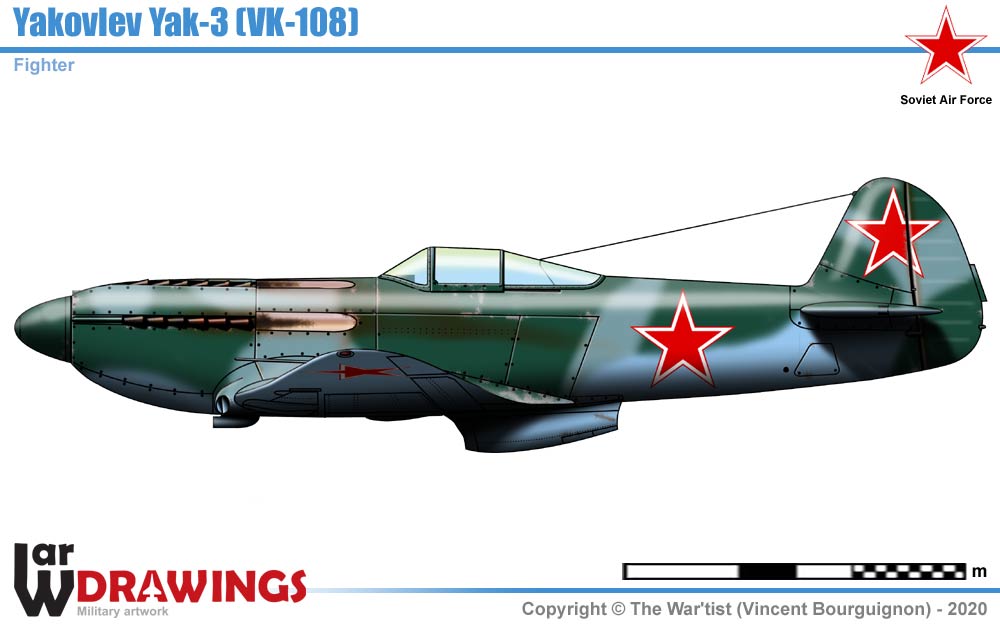 of the 1945. Yak-3 (VK-107A) modified with VK-108 engine with 1851 hp, and armed a single 23 mm Nudelman-Suranov NS-23 cannon with 60 rounds of ammunition. The aircraft reached 745 km/h at 6290 m in testing but suffered from significant engine overheating. Another Yak-3 with 2 × 20 mm Berezin B-20 cannons was also fitted with the engine with similar results. |