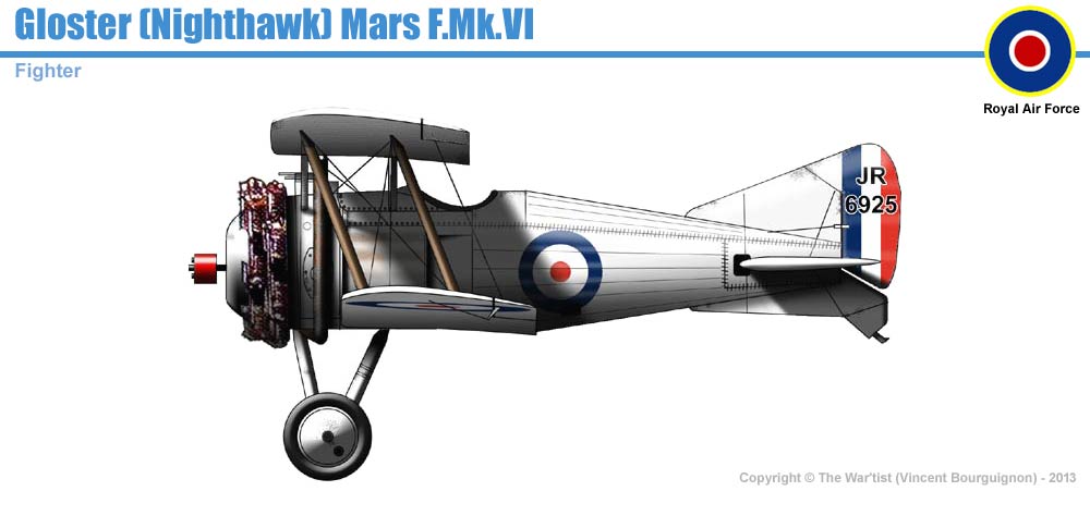 service trials in Iraq, 1923. The Gloster Nighthawk, or Mars VI, replaced the Dragonfly with either an Armstrong-Siddeley Jaguar or Bristol Jupiter radial. In 1922, the RAF acquired 29 aircraft converted from Nieuport Nighthawks by No.1 Aircraft Deport, powered by both Jaguar and Jupiter engines. |