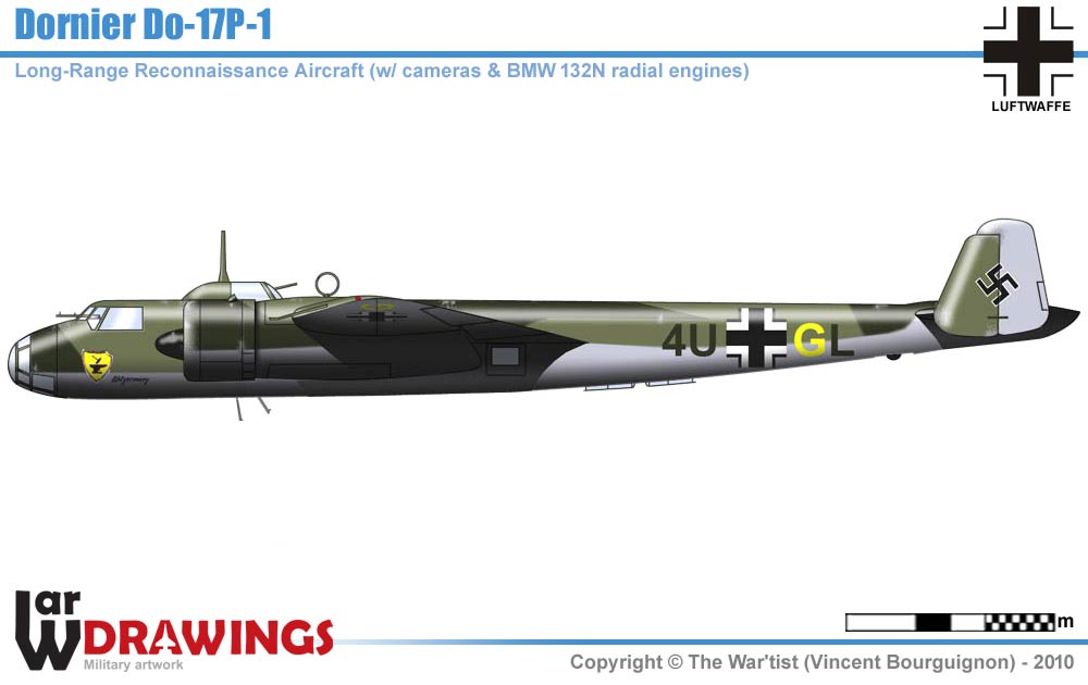 Mary", 3.(F)/123 - 1939-1940. The P variant had similar features to the Do 17M-1, with added blind flying and camera equipment for reconnaissance work. The Do 17 P was powered by two Bramo 132 N radial engines with a maximum performance of 865 hp each |
