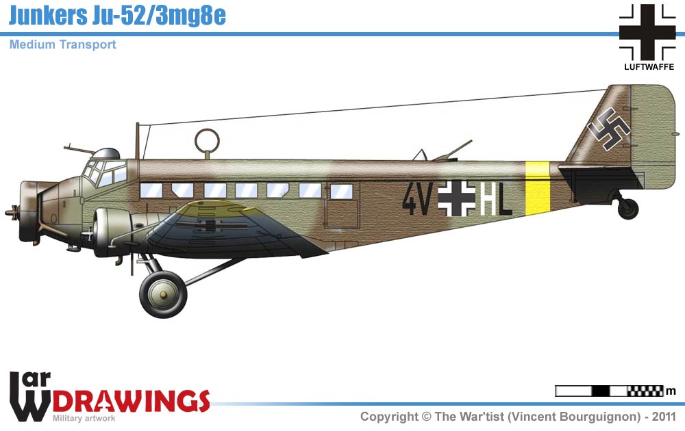 9 - +HL Ju.52/3mg8e of III./KGzbV 9 was used for transport duties on the Russian front. Fitted with an extra cabin roof hatch. .3 x BMW Z 132 engines (850 HP), 3 x MG 15, 1 x MG 131. |